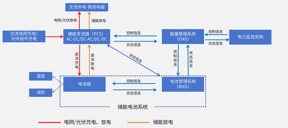 如上图所示,户用光储系统主要由光伏组件、储能电池、储能变流器/逆变器及监控管理系统等部分组成,其中光伏组件的作用是将太阳能转化为直流电能,并通过变流器(PCS)给储能电池充电或给负载供电;储能电池的作用是储蓄来自光伏组件或电网用电低谷时的电能;变流器(PCS)的作用是提供交直流的双向转换能力。