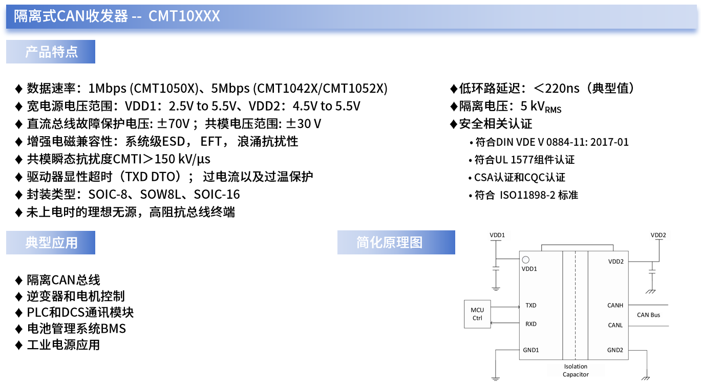 例如,CMT10XXX就是一系列高可靠性的隔离式CAN收发器,其内部集成了基于电容隔离技术的双通道数字隔离器和一个标准的CAN收发器,有助于简化系统设计,提高系统可靠性。