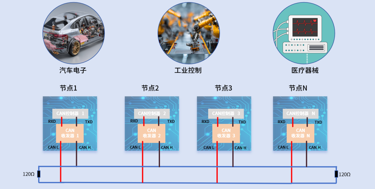 在汽车电子领域中,几乎所有的电子控制单元(ECU)都通过CAN收发器连接到CAN总线上,从而实现各电子控制单元(ECU)之间的协同交互。