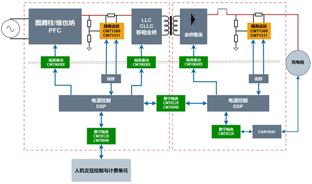 CMT1300、CMT1311等隔离运放芯片通常应用在充电桩中的PFC电路和DC-DC电路中,以阻断高压母线与低压控制电路(MCU/DSP)的直接连接,防止触电风险及设备损坏,并同时将高压母线的电流信号精准转换为低压控制电路(MCU/DSP)可处理的数据信号,满足环路控制需求,确保充电桩系统的稳定运行。