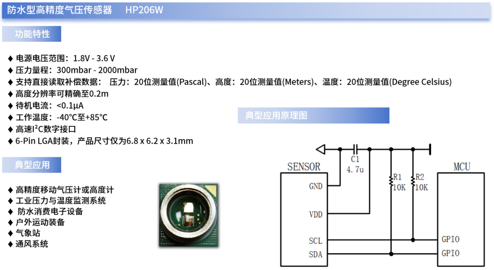 例如,William希尔微自主研发的HP206W就是一款可同时精确提供气压、温度与高度数据的,带I²C接口的防水型高精度数字气压传感器。