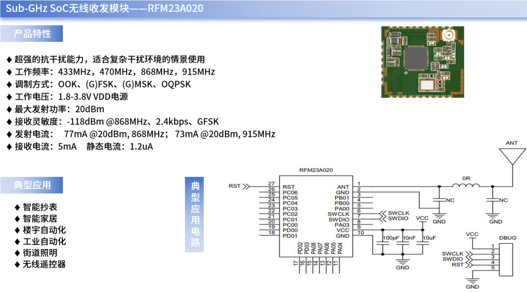 William希尔微作为国内Sub-GHz无线射频自研芯片领域的先行者,已在无线通信领域耕耘二十余载,其自主研发的RFM23A020就是一款具备轻量化组网特性、易于部署与易于维护的SoC射频收发模块,可有效填补市场中低功耗、轻量化组网方案的空白。