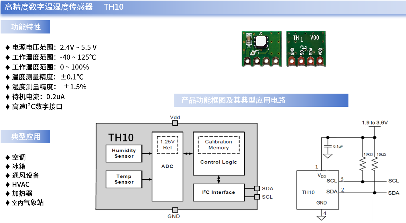 TH10的温度测量精度为±0.1°C,相对湿度测量精度为±1.5%RH。TH10支持两个用户可选的I2C从地址和高达400KHz的I2C通信速率。TH10的工作电压范围为2.4V~5.5V,能兼容多种不同的应用场景。