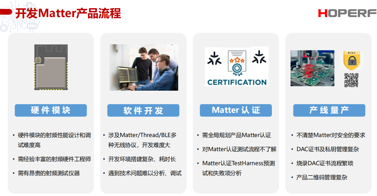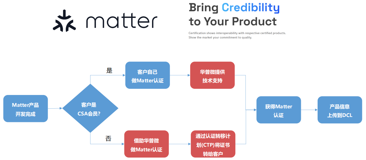 以智能照明为例,企业开发者可直接采用市场中成熟的Matter模块,在模块原厂配合下快速完成LED灯具产品研发后,只需通过模块原厂提供的技术支持或者认证转移计划(CTP)即可快速拿到Matter认证,将产品接入市面主流的生态平台之中。