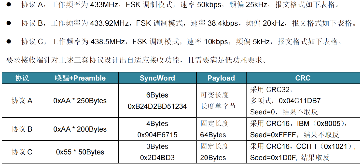 例如,当用户接收端需自适应接收来自发射端3套不同设置的协议信号时(如协议A、协议B和协议C,且它们在发送信号时都含有足够长度的导频信号),具备快速切换预存配置功能的CMT2312A便可充当此通信场景下的接收机,并通过软件烧录好与之对应的预存配置,以便快速在不同的预存配置中来回切换监听。
