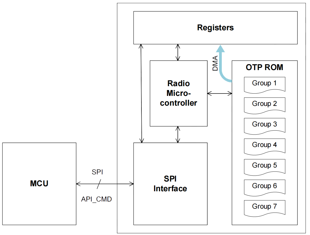 注:OTP ROM(一次性可编程只读存储器)是一种用于存储芯片运行所需的永久性配置数据(如射频参数、校准信息或加密密钥等)。它的核心特点是只能写入一次,数据一旦固化便无法修改,适合需要高可靠性和安全性的场景。CMT2312A共支持预存多达7组配置,并可通过操作API_CMD指令方式,实现切换7组配置中任意指定的一组。