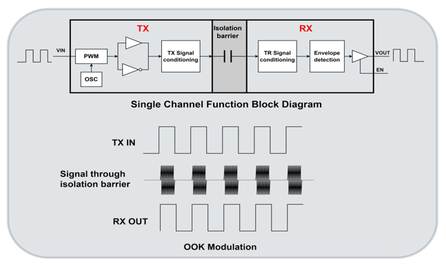 所谓数字隔离器,实际上就是在一颗芯片两侧实现的一个微型无线射频收发系统。在此系统中,射频发射端将要传输的数据信号通过OOK调制为高频脉冲信号,而后在电容电场的耦合作用下,高频脉冲信号耦合至射频接收端,并通过OOK解调为初始的数据信号,从而在电气隔离环境中完成数据信号的有效传输。